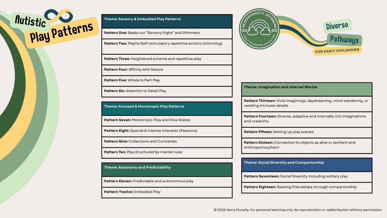 These patterns move away from deficit-based interpretations of play and instead offer a strengths-led, neurodiversity-affirming lens.